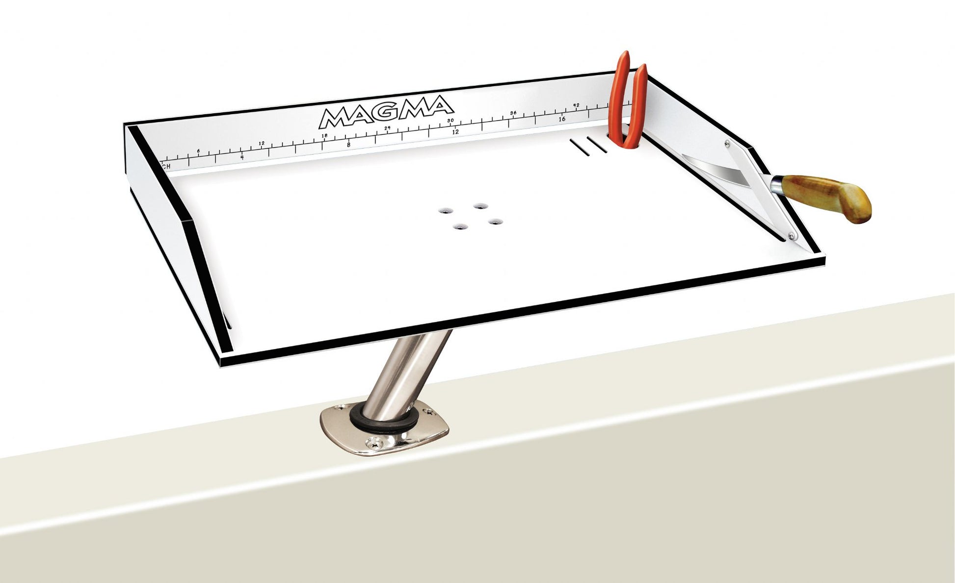 The Magma logo and ruler has been engraved to show the black core for a clean look while increasing visibility when measuring the days catch. Not just designed for bait preparation or fish cleaning, these tables are FDA approved for food preparation or service. Constructed with commercial quality UV stabilized compression molded high-density polyethylene that is virtually indestructible, practical, and more sanitary than wood filet tables. These tables will not crack, peel, mildew, absorb bacteria or fish odors, allowing you virtually maintenance free use. Equipped with (2) redesigned knife holsters that accommodate larger fillet knives, handy receptacle for Pliers, rounded edges / corners for safety, and side channels with a slotted table back that permits drainage from the work surface while keeping your deck clean of scales and residue when preparing, cleaning, or filleting.
